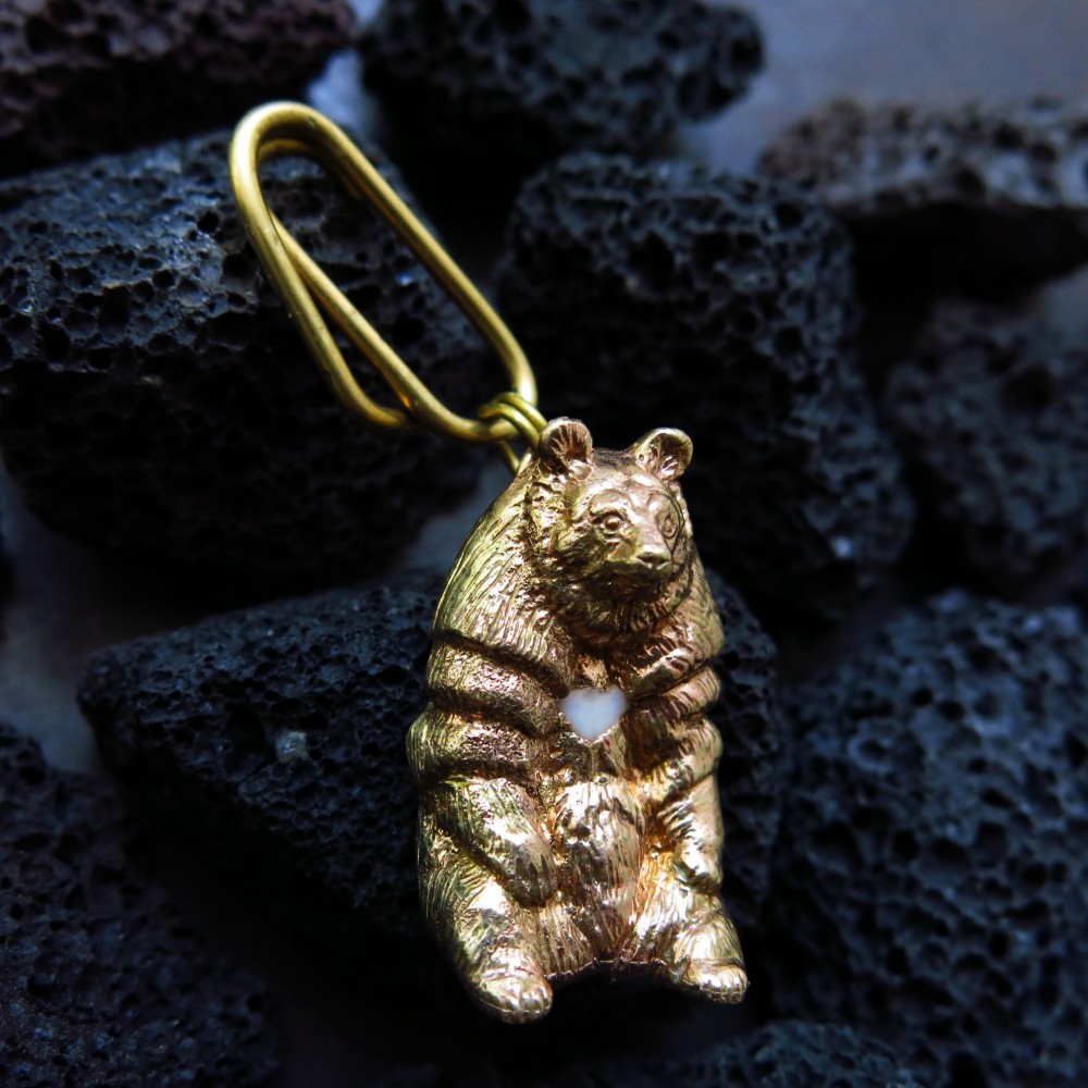 台灣黑熊是亞洲黑熊的亞種,在一萬年前的冰河期時隨著海面上升被隔離在台灣本島,成為台灣特有的原生熊類,也是最具代表性的本土動物。牠們分布於台灣1000~3500m的山區。其全身烏黑,胸口有弦月形白毛,頭頸周圍有特別旺盛的鬃毛,牠們也是唯一懂得利用芒草與樹枝在地面或樹上製作巢的熊,常以臥姿或坐姿在其中休息。本作原模以手刻呈現台灣黑熊慵懶的放鬆坐姿與厚實的毛髮,鑄造黃銅後,以白色冷琺瑯上色凸顯胸口弦月,交映出優雅的色澤反差。